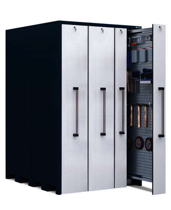 Der Vertikallagerschrank mit beidseitig nutzbaren Lochblechwänden