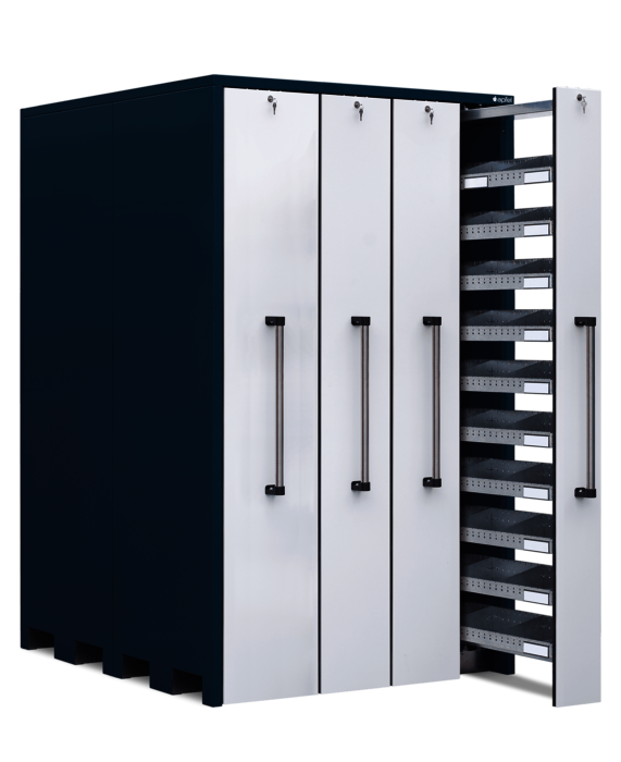 Der Vertikallagerschrank mit 10 Schüttgutwannen pro Auszug
