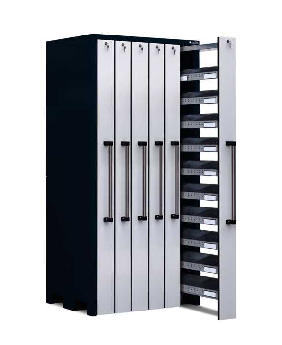 Der Vertikallagerschrank mit 10 Schüttgutwannen pro Auszug