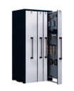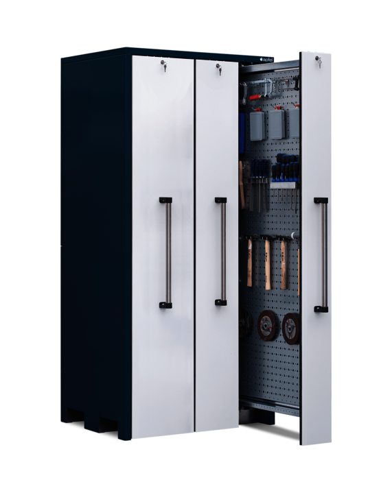 Der Vertikallagerschrank mit beidseitig nutzbaren Lochblechwänden
