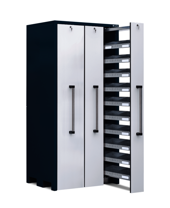 Der Vertikallagerschrank mit 10 Schüttgutwannen pro Auszug