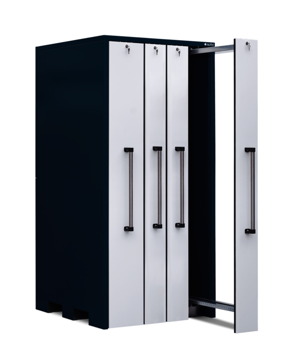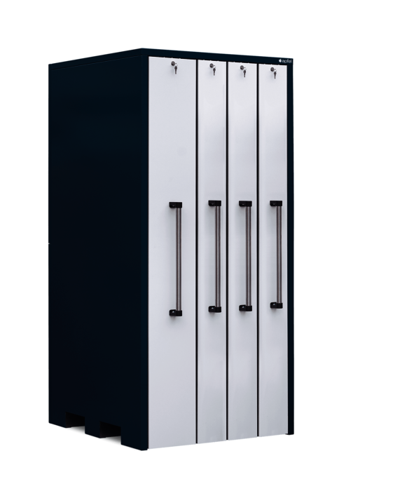 Lagerschrank mit 1 Vertikalauszug à 300 mm und 3 Vertikalauszügen à 200 mm Breite mit je 300 kg Traglast