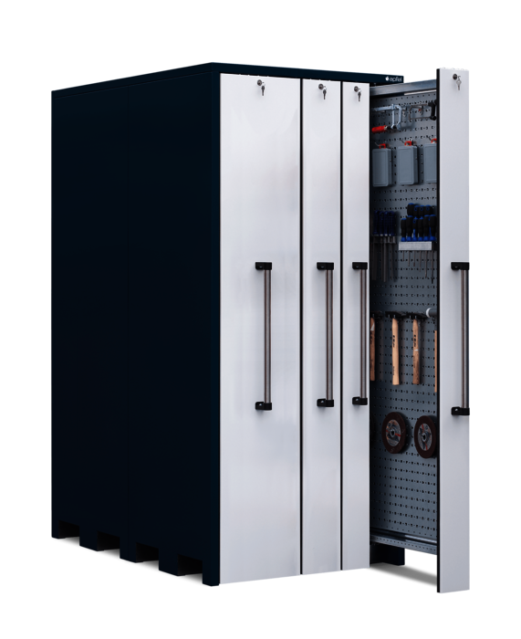 Der Vertikallagerschrank mit beidseitig nutzbaren Lochblechwänden
