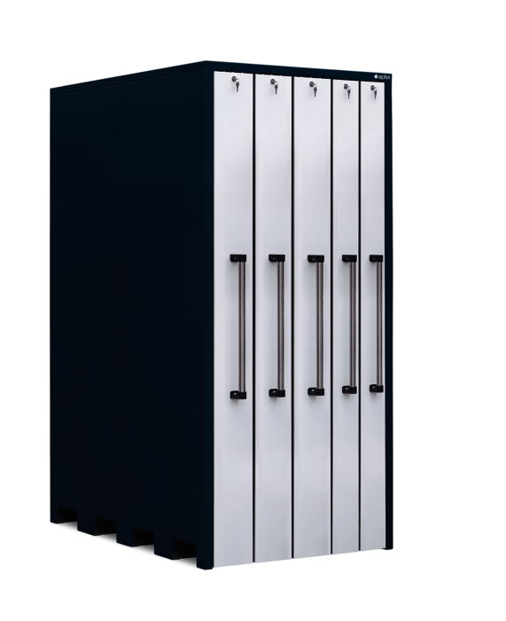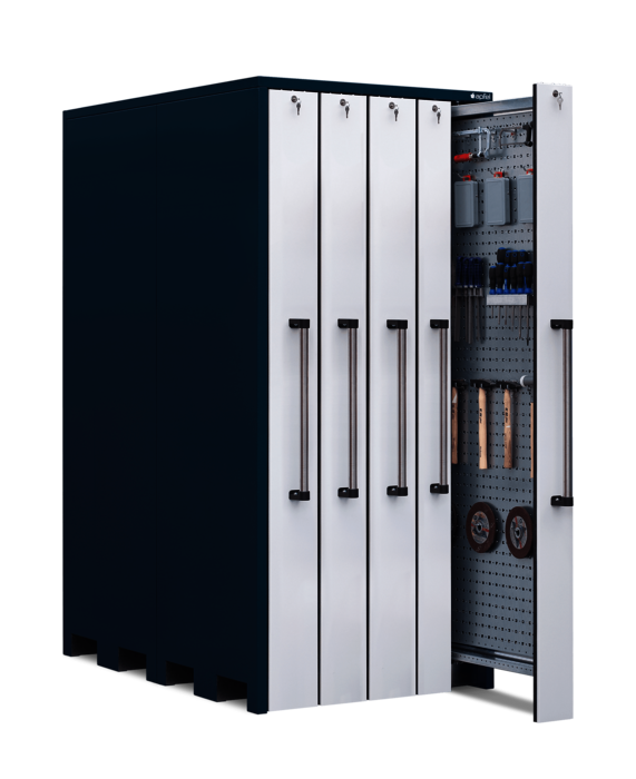 Der Vertikallagerschrank mit beidseitig nutzbaren Lochblechwänden