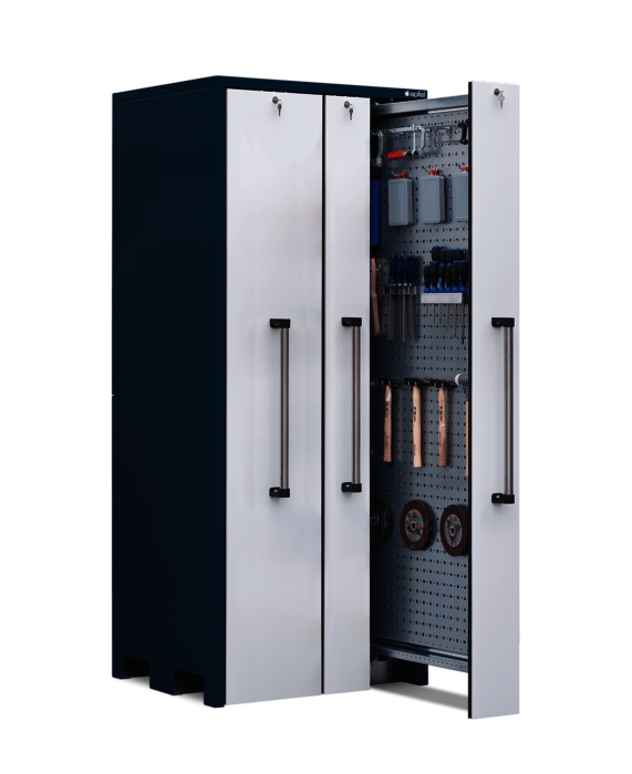 Der Vertikallagerschrank mit beidseitig nutzbaren Lochblechwänden