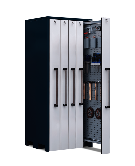 Der Vertikallagerschrank mit beidseitig nutzbaren Lochblechwänden
