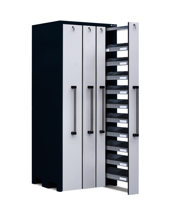 Der Vertikallagerschrank mit 10 Schüttgutwannen pro Auszug