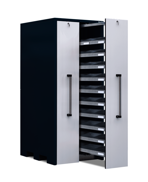 Der Vertikallagerschrank mit 10 Schüttgutwannen pro Auszug