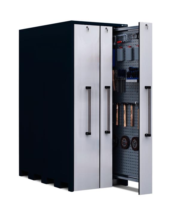Der Vertikallagerschrank mit beidseitig nutzbaren Lochblechwänden