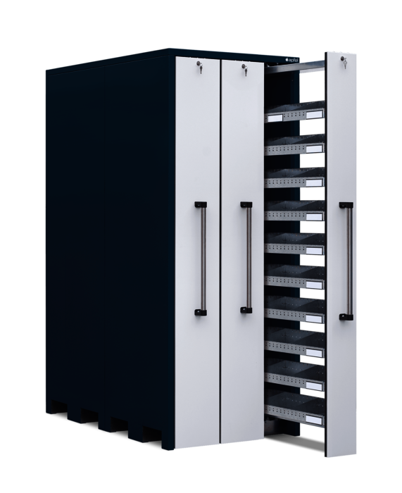 Der Vertikallagerschrank mit 10 Schüttgutwannen pro Auszug