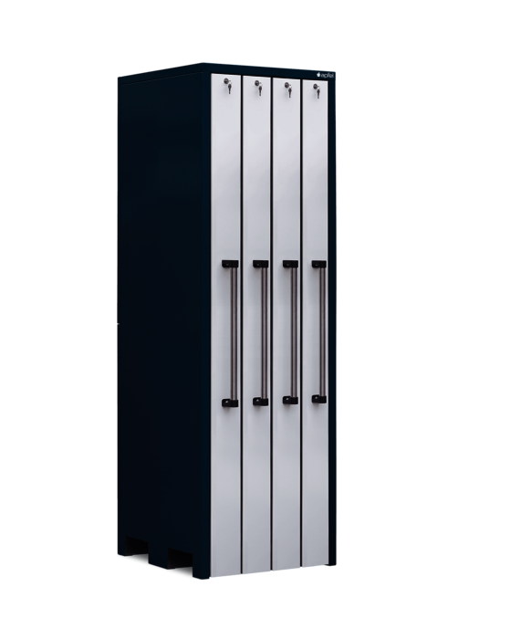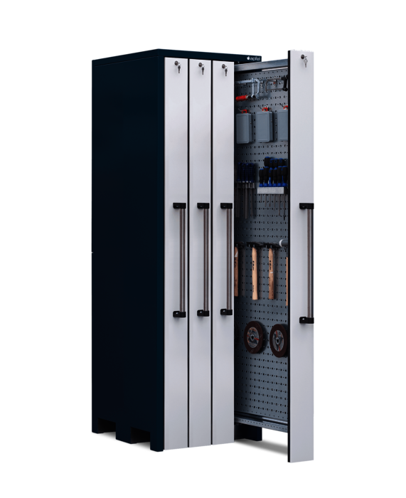 Der Vertikallagerschrank mit beidseitig nutzbaren Lochblechwänden