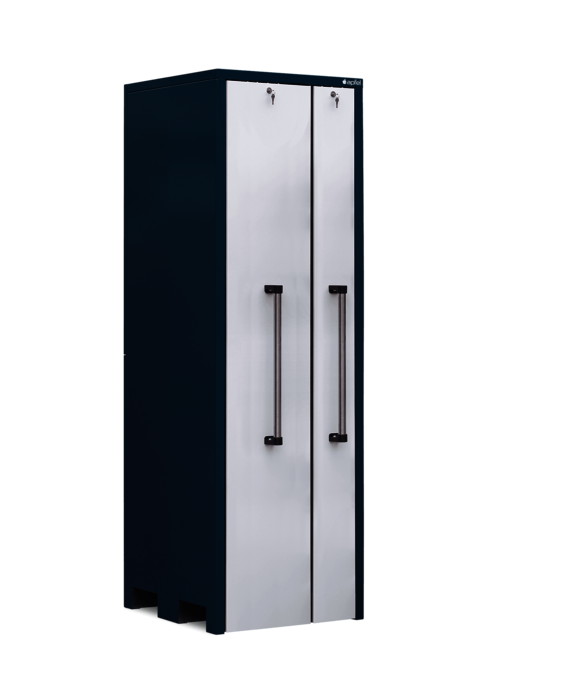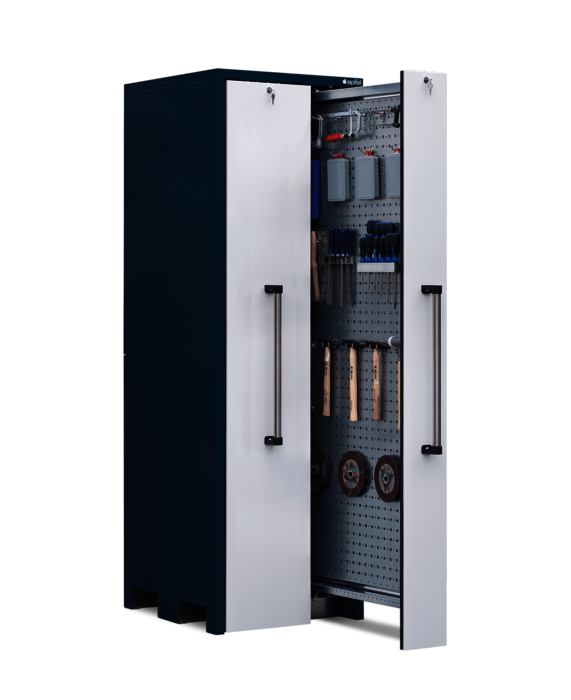 Der Vertikallagerschrank mit beidseitig nutzbaren Lochblechwänden