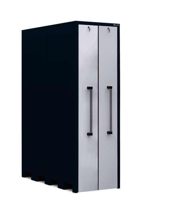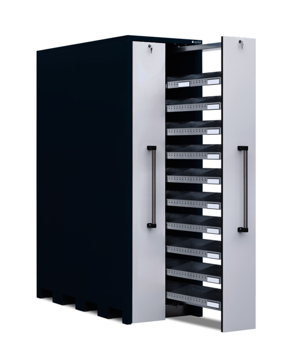 Der Vertikallagerschrank mit 10 Schüttgutwannen pro Auszug