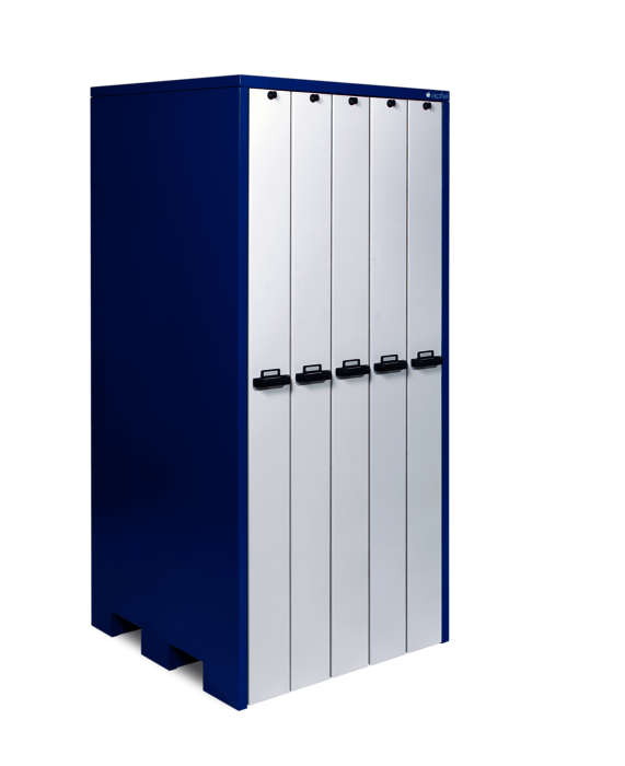 Struktur pulverbeschichtet in Enzianblau RAL 5010 (Korpus) und Grauweiß RAL 9002 (Auszüge)