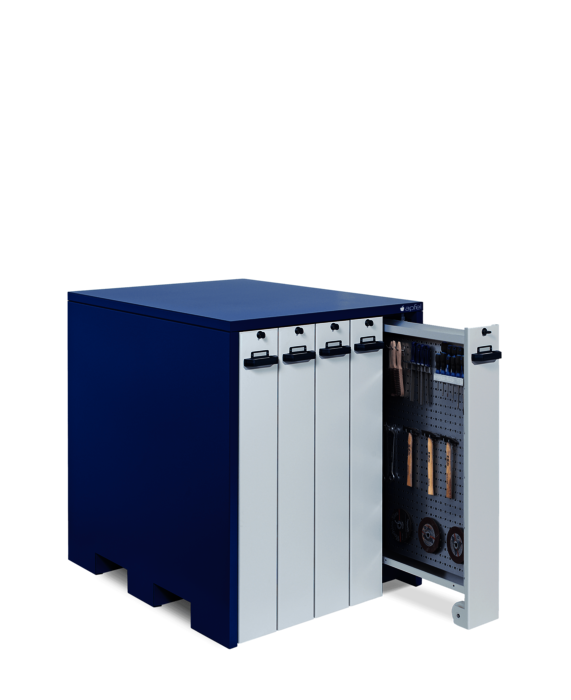 Das Kompaktformat mit 250 mm erweiterter Tiefe für die Werkzeuglagerung auf einer Gesamtlagerfläche von ca. 10 m² Lochblechwänden