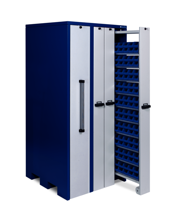 Werkzeugschrank mit 3 Vertikalauszügen à 180 mm Breite mit je 900 kg Traglast und 1 Vertikalauszug à 300 mm Breite mit 1.800 kg Traglast