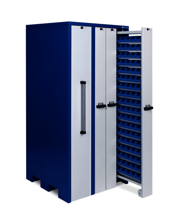 Werkzeugschrank mit 3 Vertikalauszügen à 180 mm Breite mit je 900 kg Traglast und 1 Vertikalauszug à 300 mm Breite mit 1.800 kg Traglast