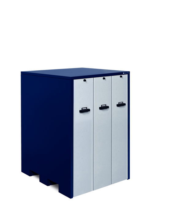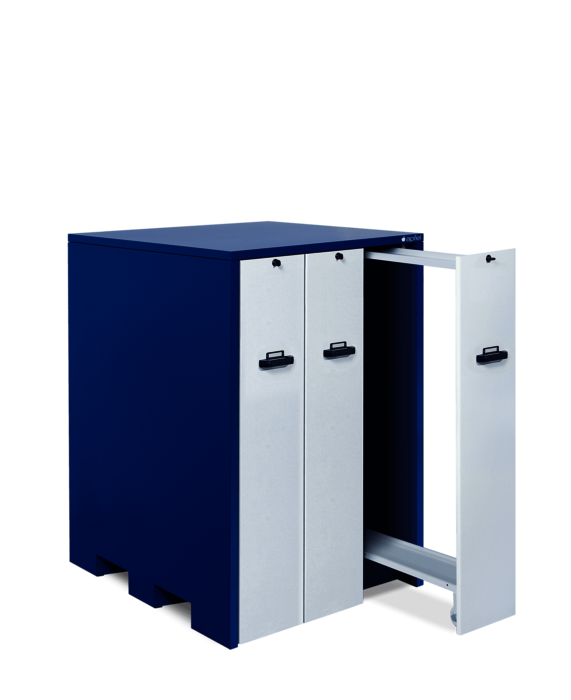Struktur pulverbeschichtet in Enzianblau RAL 5010 (Korpus) und Grauweiß RAL 9002 (Auszüge)