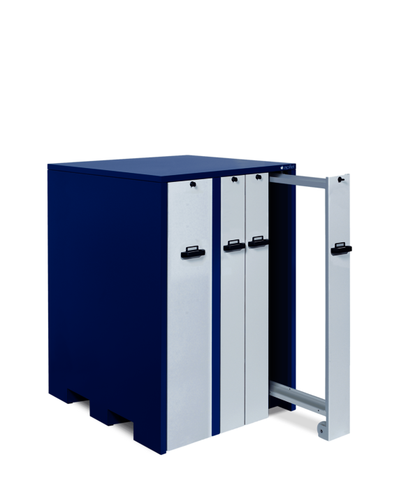 Struktur pulverbeschichtet in Enzianblau RAL 5010 (Korpus) und Grauweiß RAL 9002 (Auszüge)